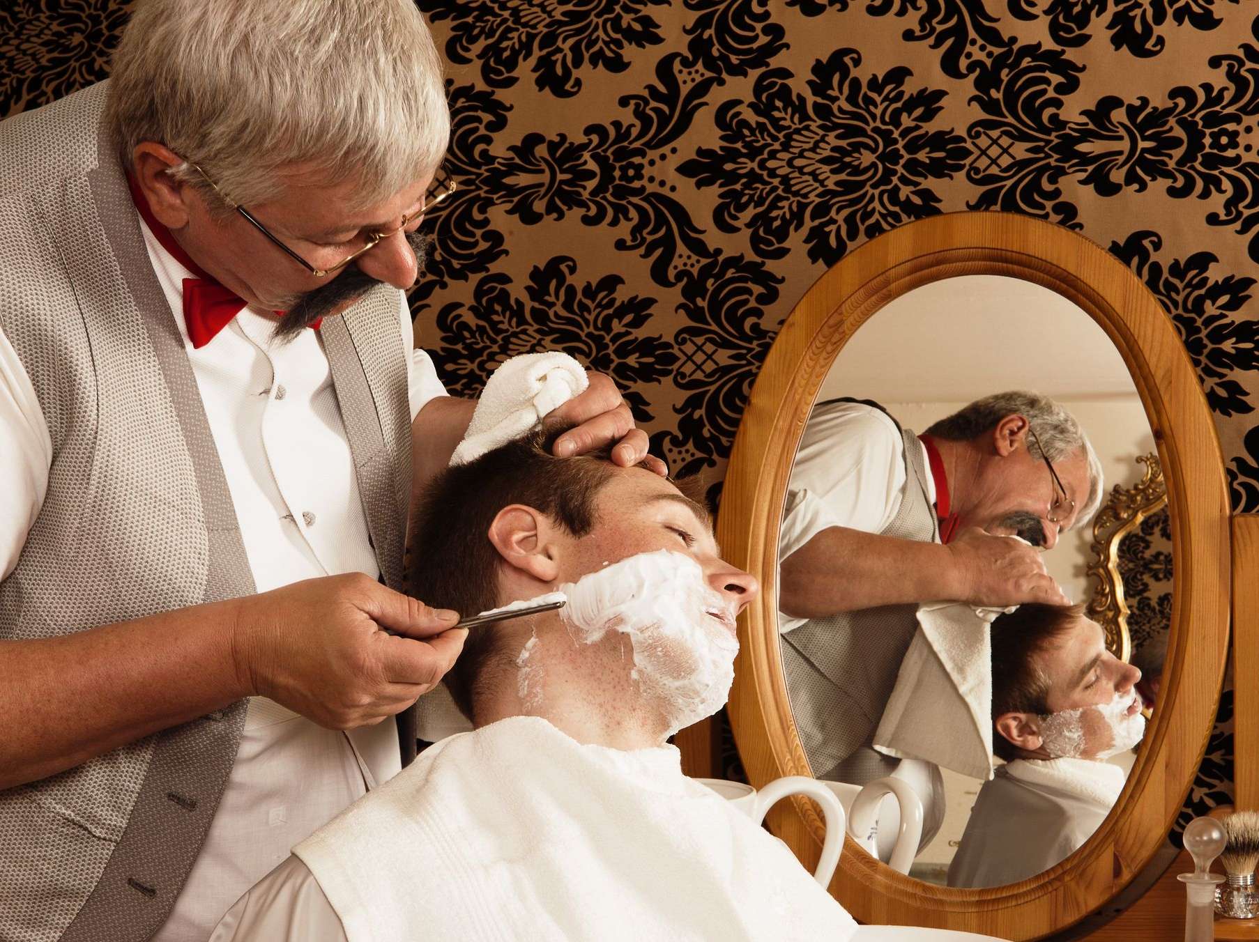 Then, using only the best steel razors on the market, our experienced Master Barbers will shave your face twice, once with the grain, and then re-lathered and shaved across the grain for the closest shave possible